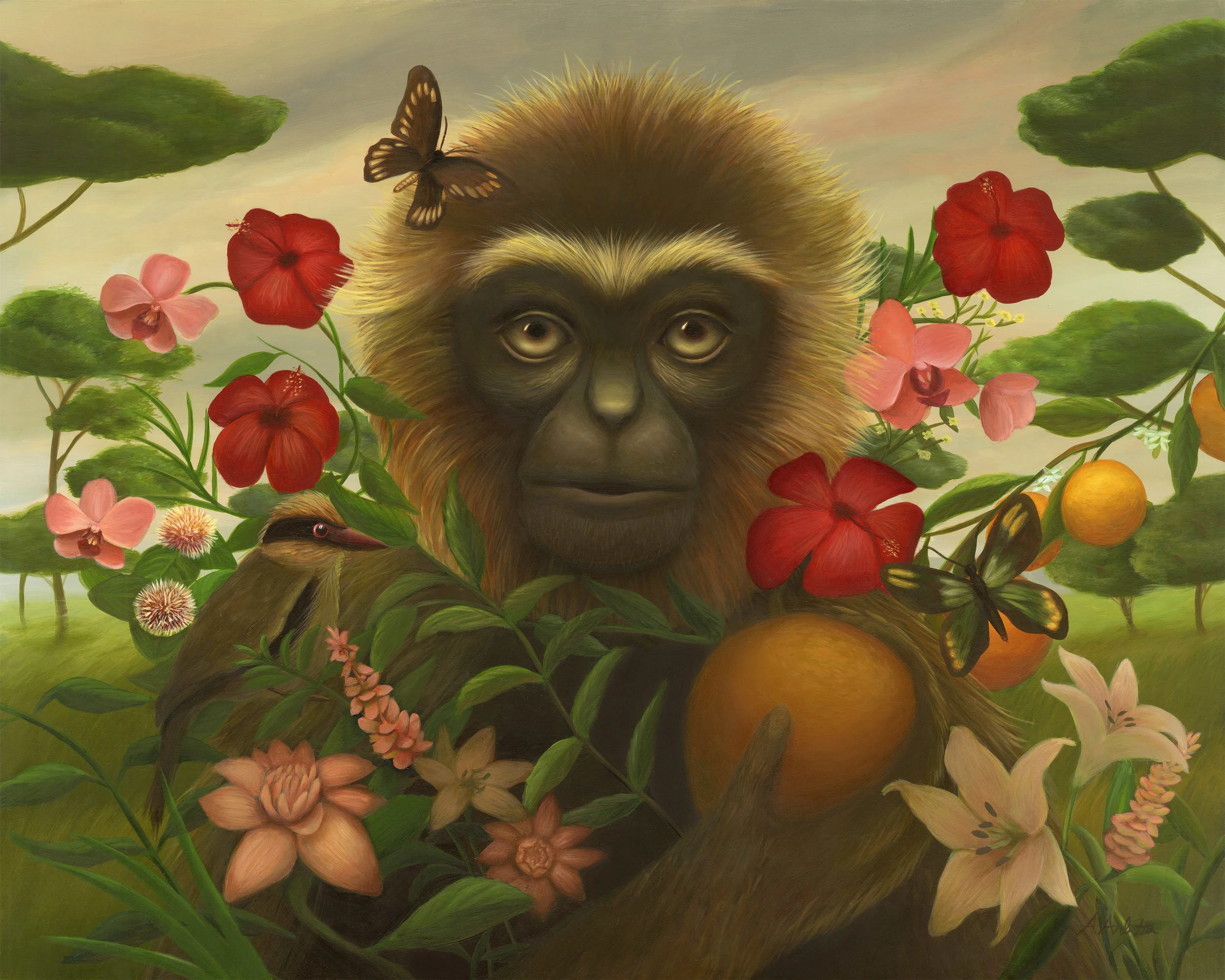 “In-Bliss” illustrates a gibbon ape staring directly at its viewer drawn by what it is seeing.